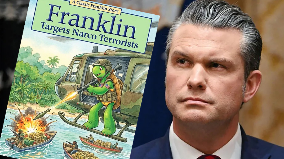 Hegseth posted an image to X last week showing a flak jacket and helmet-wearing Franklin shooting a rocket-propelled grenade from a helicopter at a boat of armed thugs emblazoned with the hilarious title “Franklin Targets Narco Terrorists.”